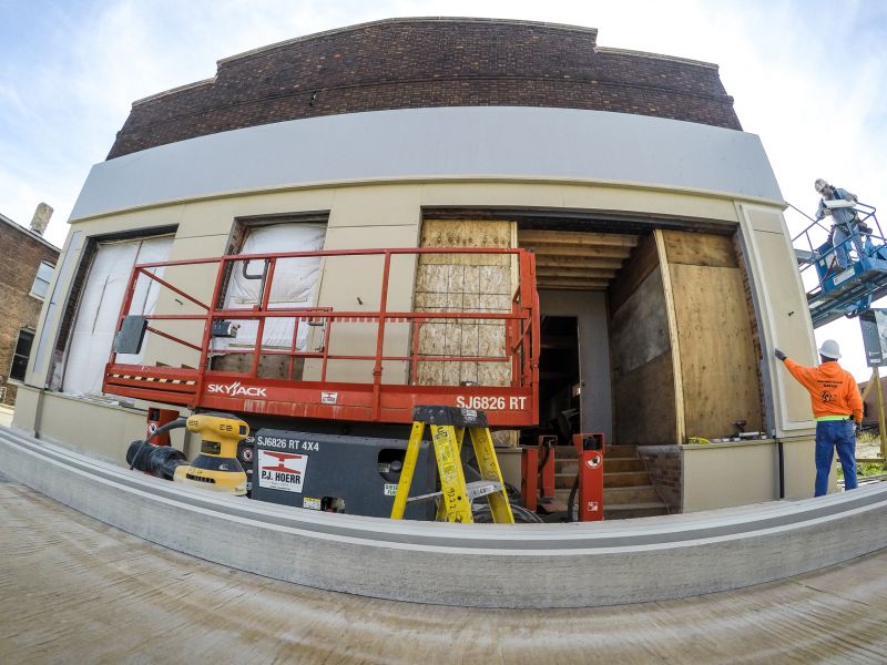 Today found stairs being installed, the front façade being constructed and the back loading dock had footings and walls being formed up and poured.