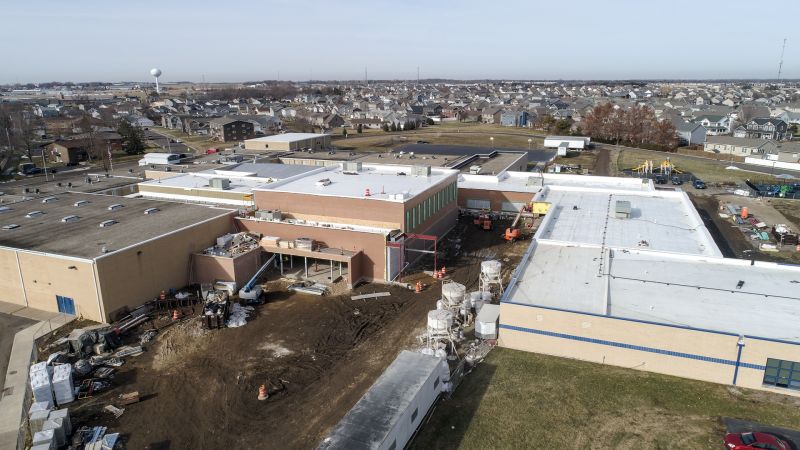 Today found windows being prepped for installation, roofers, spray foam for fire protection, duct work, painting, and electrical conduit being installed in the next stage of this construction project. Summit Masonry was installing flashing for exterior brick.