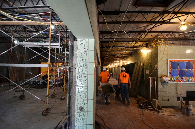 Today on the first floor steady progress continues transforming the fine arts wing into a new space for the kitchen and cafeteria. Also prep for asbestos abatement is under way.