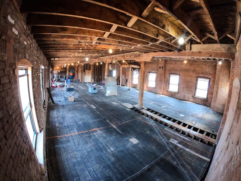Today found removal of the raised floor completed, new plumbing being installed, demo of the mezzanine, existing roof joists blasted with corn husks, temporary windows installed, and repairs of floor beams with epoxy.