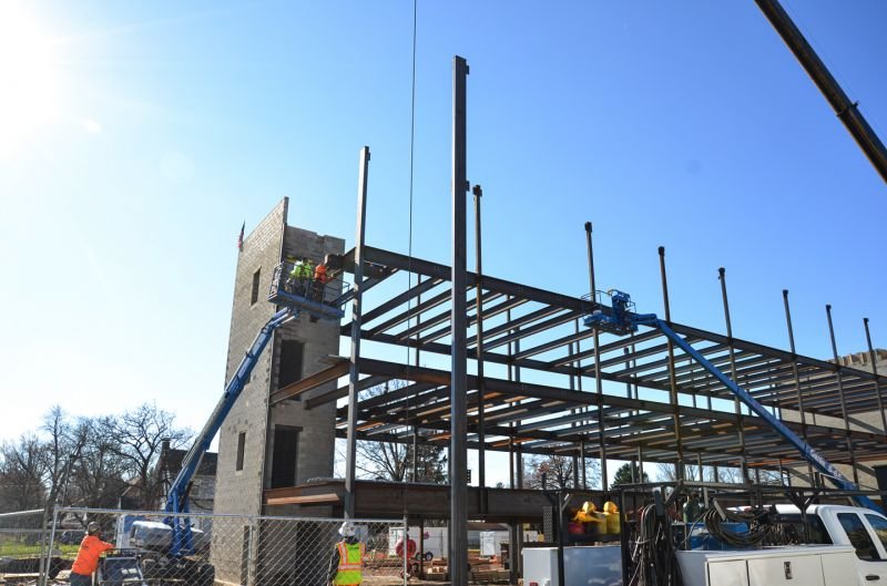 Today found steel erection under way for this 4-story 50,000 sq. ft. building addition to the Buehler Home campus. The top two floors will be two bedroom independent living apartments. The second floor will include a fitness / therapy area with a walking track as well as a casual dining bistro with outdoor rooftop seating. The first floor will include a parking garage for residents as well as two therapy pools and locker room area.