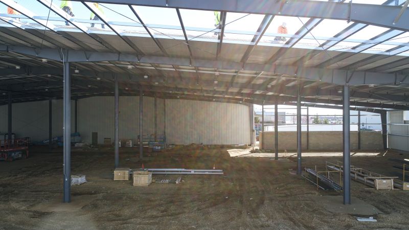 Today found roof panel installation nearing completion. This project consists of a 54,000 sq. ft. addition to the existing facility that will serve as added warehouse/product assembly space for their existing manufacturing and distribution processes. This is a pre-engineered metal building addition as manufactured by Butler Buildings being added onto an existing pre-engineered building P. J. Hoerr furnished and erected in 1997.