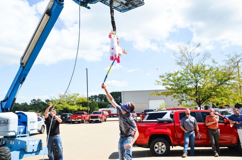 This afternoon, P.J. Hoerr hosted a luncheon for 3 employees that are either engaged or just got married. After lunch some of the kids and a few of the adults took some swings at the pinata out in the parking lot.