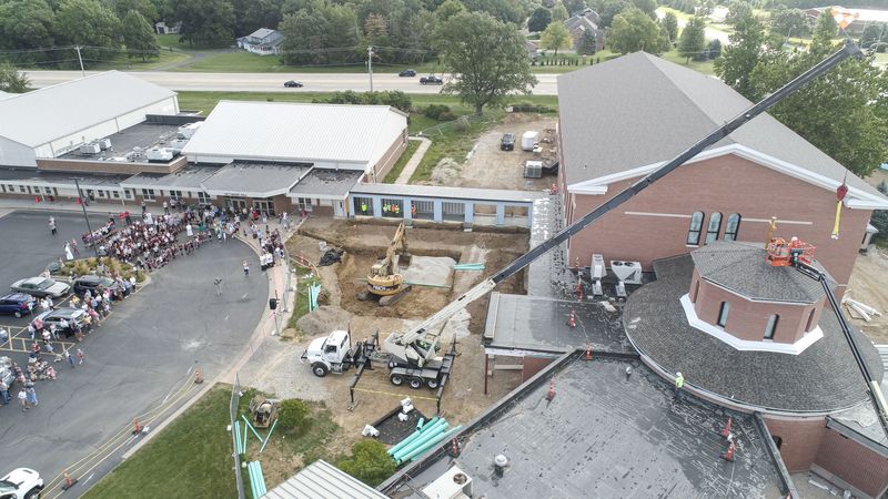 Today a crane and an 85’ JLG lift was onsite to set a cross on the rotunda. Those attending 8:30 mass, the kids and teachers of St. Jude’s, and others from the parish were in attendance. Fr. Henehan conducted a blessing for the setting of the crosses. Construction in progress photos were also taken of the building.