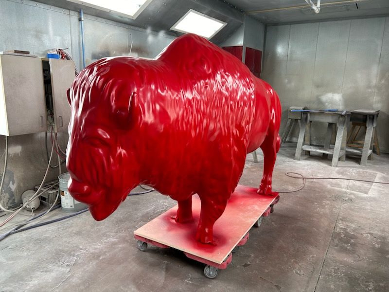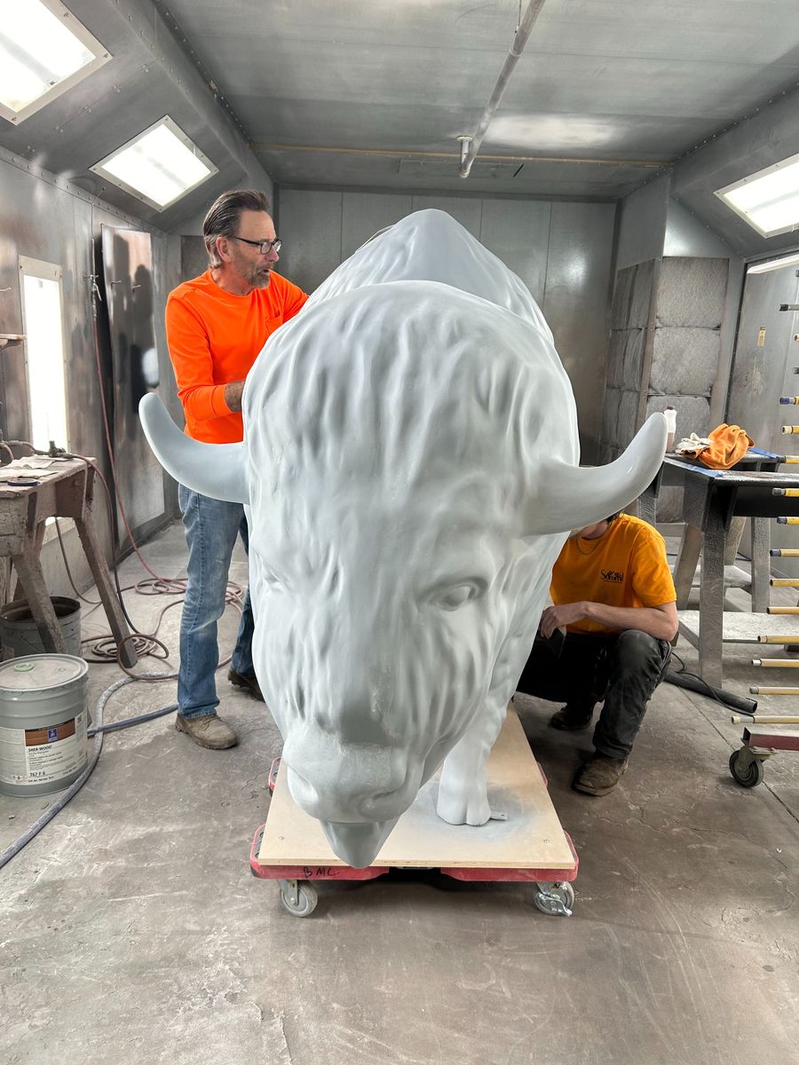 I know we said this would be the last time you'd see our bison's face, but we just couldn't help it. Here's a little sneak peek at Benny's base coat. Even though you can't tell what color he is right now, we can assure you, you won't be able to miss him. After endless sanding even after the primer, Phil put on Benny's base coat. He used a paint spray gun to ensure that his base was nice and smooth for our artist to work her magic. Phil wants you all to know, the base coat is the most important part! Over the next 2 weeks Benny will be getting painted with features and details that will capture our design and bring him to life.....woohoooooo! He's ready to meet the community and celebrate Peoria's birthday with you all!